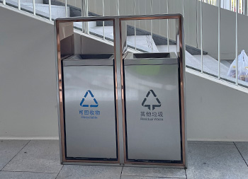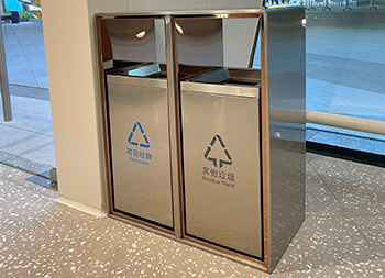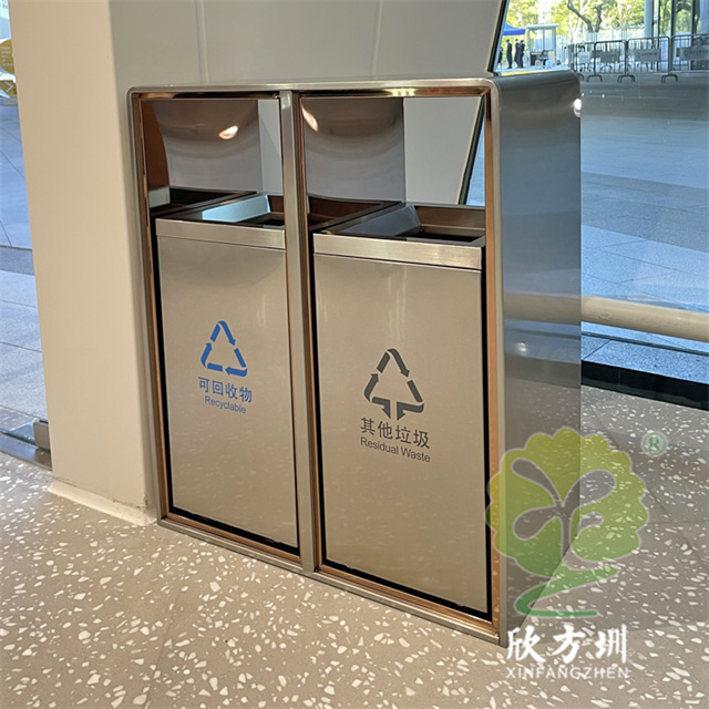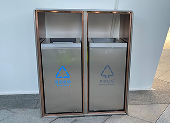 户外电镀香槟金不锈钢分类垃圾桶采用了201#不锈钢板制作而成,两连体方形分类抽拉式滑轨设计,垃圾箱桶身整体为金色本色,内框架采用了电镀香槟金边框,双面投口外桶资讯位置丝印单色的最新国标分类标识,可回收物油墨丝网印刷了蓝色、其他垃圾油墨丝网印刷了灰色,这款垃圾桶高档轻奢美观大气。