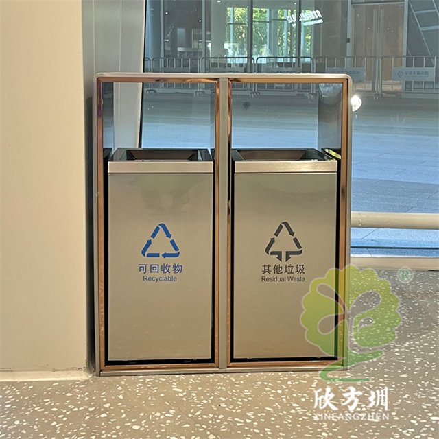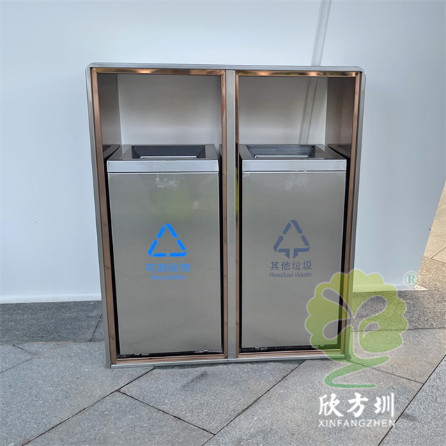户外电镀香槟金不锈钢分类垃圾桶这款垃圾桶制作精良,户外两连体分类方形不锈钢本色哑光滑轨设计,适合摆放在城市广场、市政街道、物业小区、旅游景区等等,注重产品细节部位处理坚固耐用,安全无利口,不伤手,201不锈钢外筒,镀锌板内筒 , 可以定制不锈钢内筒、玻璃钢内筒、或者塑料内筒等,便于垃圾清倒。
