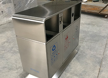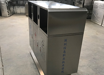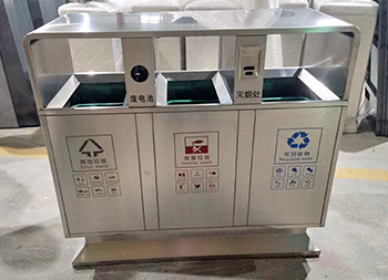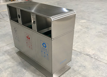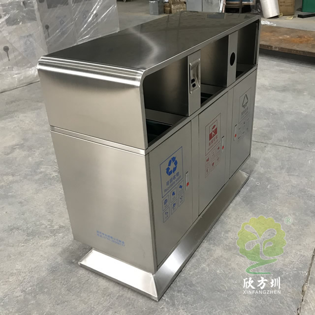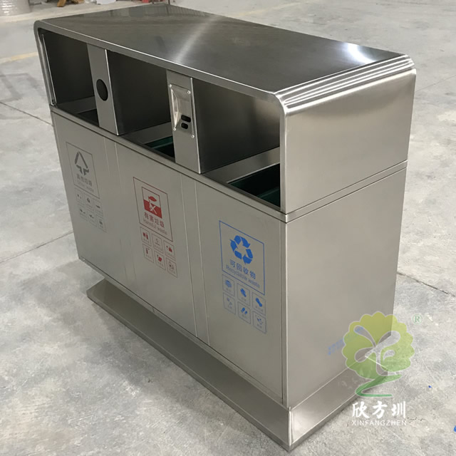 户外校园环卫三分类不锈钢垃圾桶采用优质的201不锈钢板裁剪折弯拼接焊接打磨而成,此款垃圾桶采用双面投口三分类可回收物、有害垃圾、其他垃圾设计,投口上端带一个废电池和灭烟处小型投口方便收集烟头和废电池,垃圾箱顶部平滑设计,可以丝印垃圾分类标识logo及企业名称。