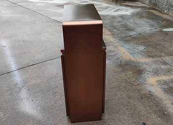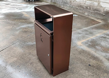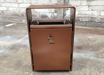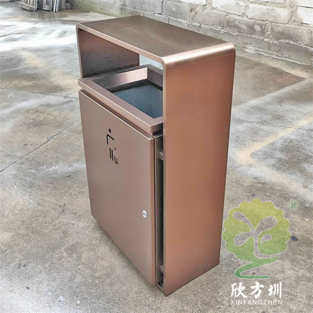 室内新楼盘电梯口电镀不锈钢垃圾桶采用201不锈钢板制作而成,室内单桶方形设计,果皮箱表面电镀喷塑上色,正反面人头标可以采用镂空或者腐刻丝印,桶身正反面下方丝网印刷企业logo,三角钥匙开门可以取出内置内筒,顶部无烟灰盅需要烟灰盅可以定制。