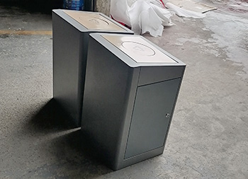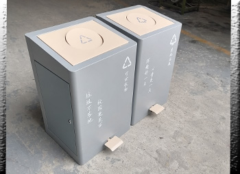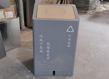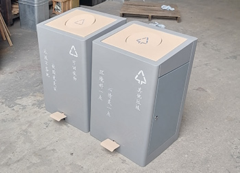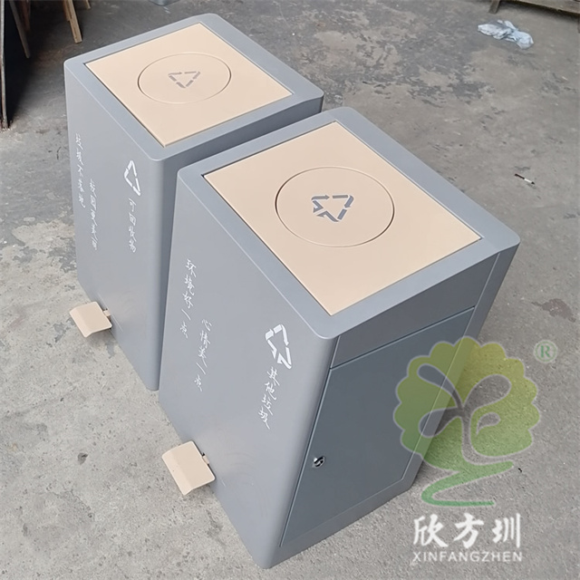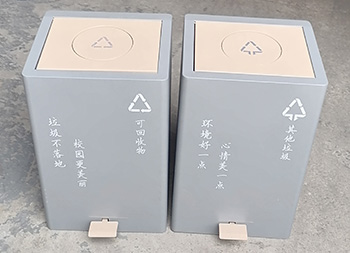 室内学校脚踏组合式不锈钢分类垃圾桶外桶整体优质201不锈钢生产,厚度1.0mm厚度(足0.92mm),方形组合式带脚踏盖子加摇盖双开盖设计,颜色按照甲方要求颜色喷塑,外桶表面整体喷塑浅灰色,使用了白色油墨丝印了可回收物和其他垃圾分类标识和文字。