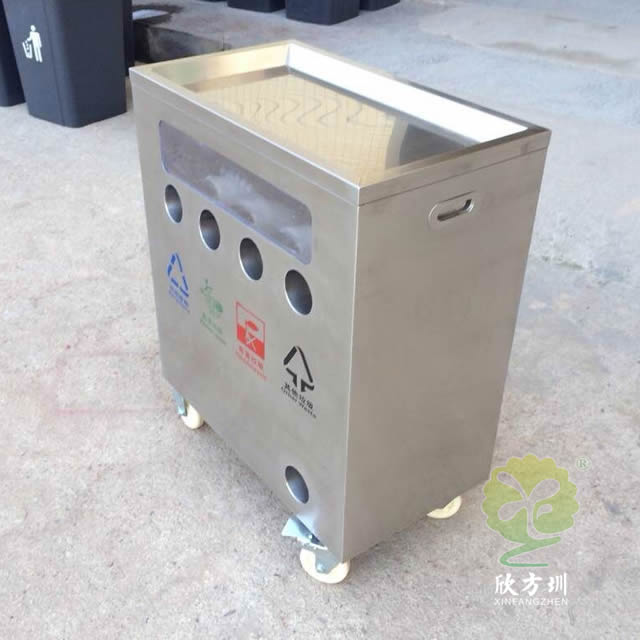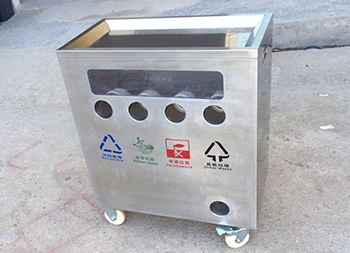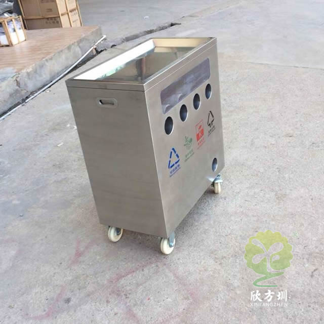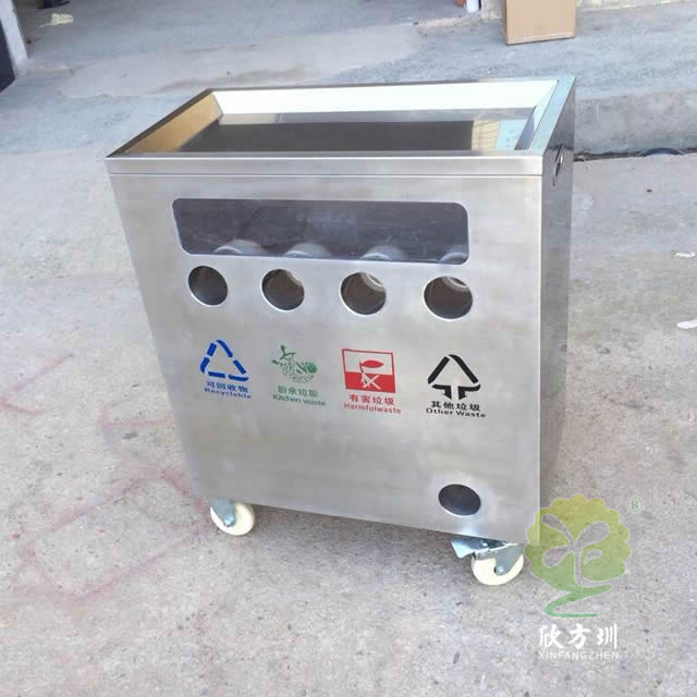 幼儿园训练分类不锈钢垃圾桶这款垃圾箱材料201新料不锈钢板制作而成,方形四分类底部带轮子投口圆形设计,正面丝印了可回收物、厨余垃圾、有害垃圾其他垃圾的分类标识,左右顶部带把手发布抬动,底部四个滑轮方便推动,桶内四个塑料管道无内筒,是一款学校训练培训养成垃圾分类的垃圾箱。