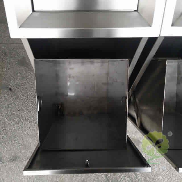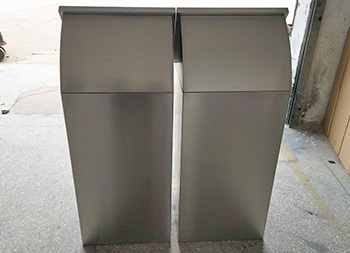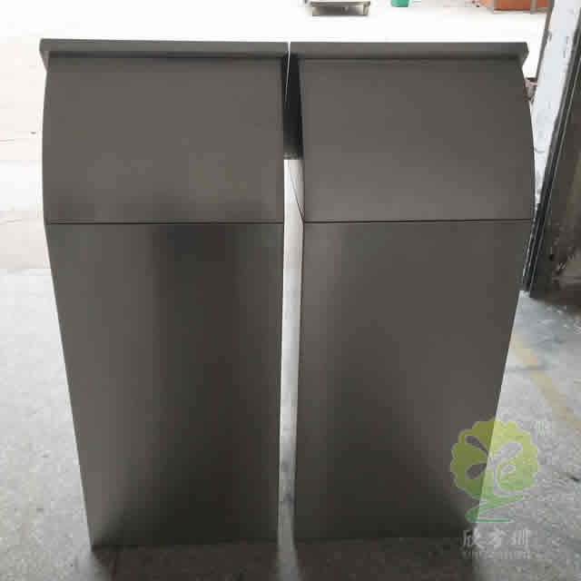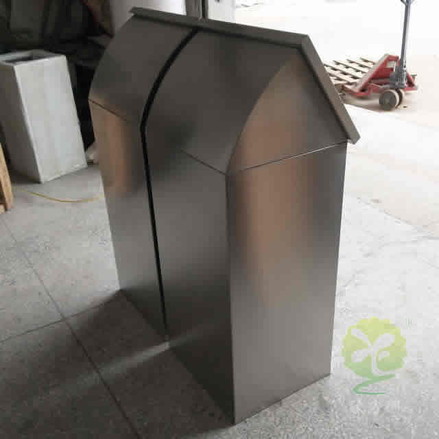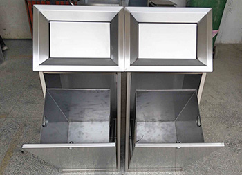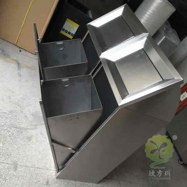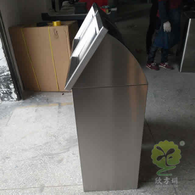室内摇盖式不锈钢分类垃圾桶整体采用了304不锈钢板制作而成,整体不锈钢本色方形屋形摇盖式分类组合式设计,正面顶部三角钥匙抽拉式开门可以里面的方形取出内筒,正面和顶部坡面可以丝印分类标识及企业名称,这款垃圾桶可以任意组合我们欣方圳厂家是一家专业定制不锈钢垃圾桶的厂家,支持来图来样根据您的规格可以制造相似度高达90%以上。