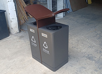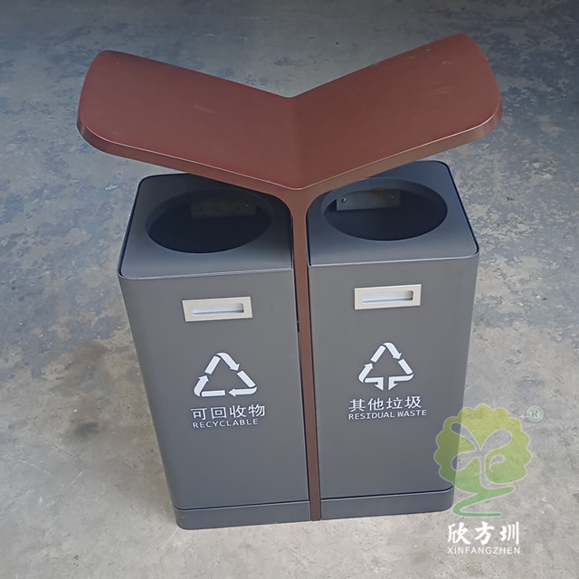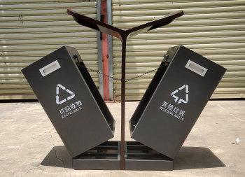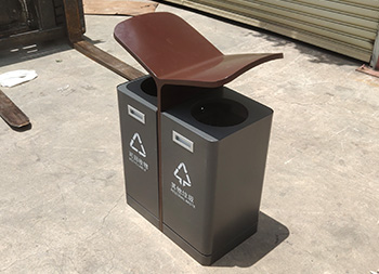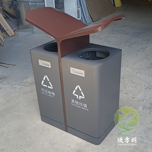 户外翼形喷塑不锈钢分类垃圾桶采用了304不锈钢板制作而成,外桶和底座采用了灰色喷涂喷塑,翼形挡雨棚采用了巧克力色喷涂喷塑,两分类圆形投口设计,两面都带把手,正反面丝网印刷了白色字体的可回收物和其他垃圾,侧面开扇式取出内筒如跑车开门大气威武。