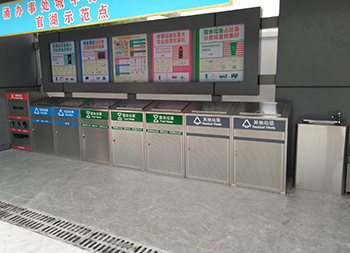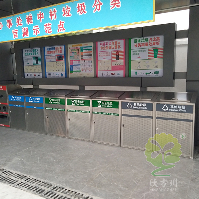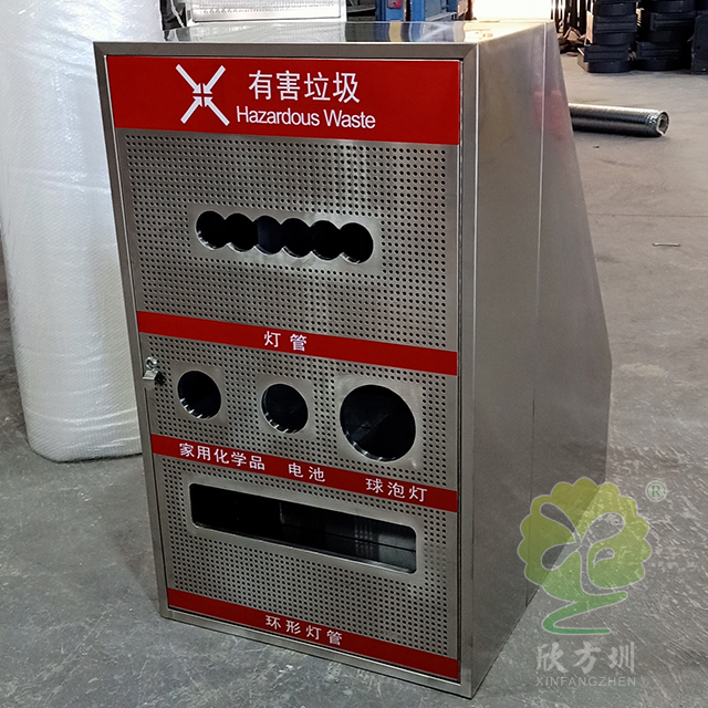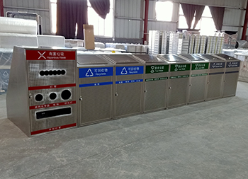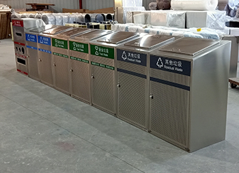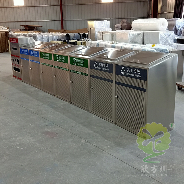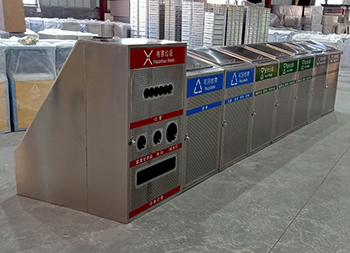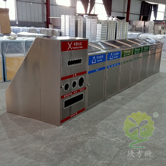 大容量资源分类不锈钢垃圾桶是一款大型定制的不锈钢玻金塑纸,采用了方形组合式镂空设计,由有害废弃灯管、可回收物、其他垃圾和厨余垃圾组合分类的,前面垃圾桶门带圆形的镂空工艺,每个垃圾桶门配备了三角钥匙开门设计,桶盖斜坡把手开盖扔废物,废灯管投口圆形多口,是一款配备大型垃圾分类宣传栏使用的。