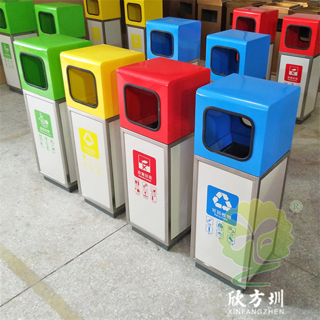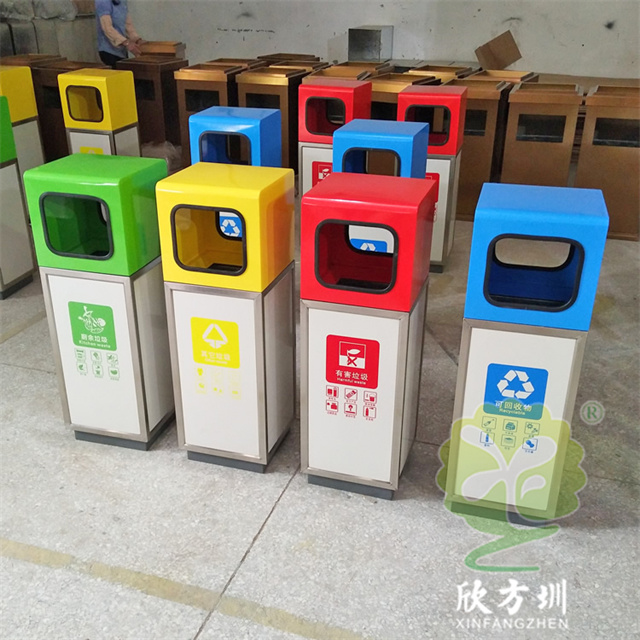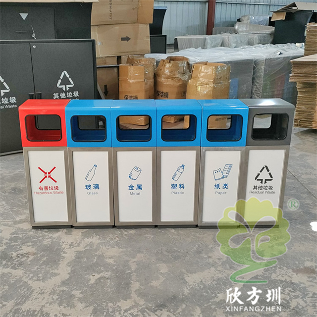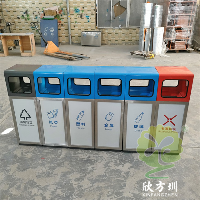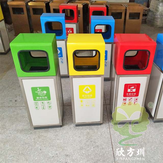 户外组合式不锈钢分类垃圾桶图片桶身使用了201#不锈钢1.0厚的板材制造,产品型号:E203-3,产品型号:产品规格:300*300*900mm,双面投口方形单筒组合式摆放分类设计,表面采用了多色彩喷塑可以按照用户需要烤漆,可丝网印刷玻璃、金属、塑料、纸类、其他垃圾、有害垃圾等最新国标分类标识,取出顶部投口可取出内置的内筒方便清理废物,内筒材质采用了镀锌板常规内筒。