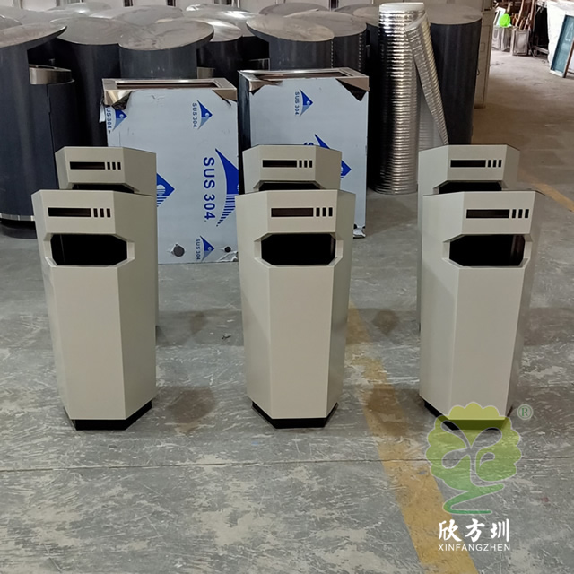 以上室内异形喷塑不锈钢垃圾桶图片采用了1.0mm厚的201不锈钢板制作而成,型号:C774,规格370*370*750mm,简练异形六边形喷塑室内外规划,垃圾桶专门喷塑了米白色底部和后面顶部喷塑了黑色,正面顶上垃圾桶投口,投口顶部是一个烟灰盅装烟头的,背后开门取出内筒方便整理内筒废物以及烟头,可以摆放在室内电梯口、酒店或许室外。
