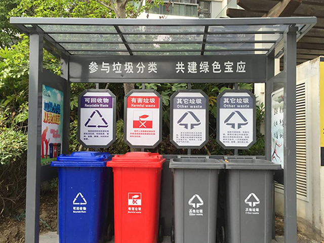 户外小区四分类垃圾亭亭最重要的一个作用是可以避免垃圾桶内的垃圾因为雨水的冲刷对环境造成二次污染,许多垃圾分类亭都是放置在人流会集的区域,这写当地每天会发生许多垃圾,假如缺少了这些垃圾分类亭的遮挡,垃圾露天放置的话,遇到雨水气候就会发生许多污水,严重影响了周边环境,这也是为何许多当地都开始安放垃圾分类亭的重要原因,这些设备也是帮助我们保护环境的重要方法。