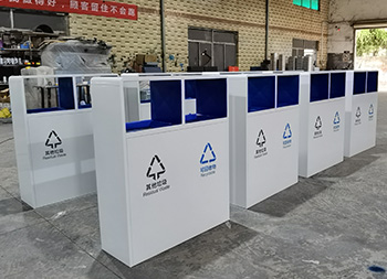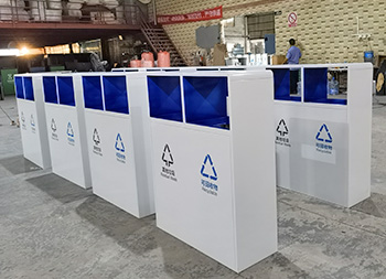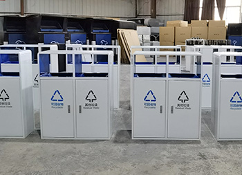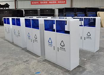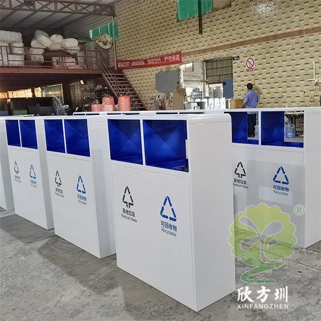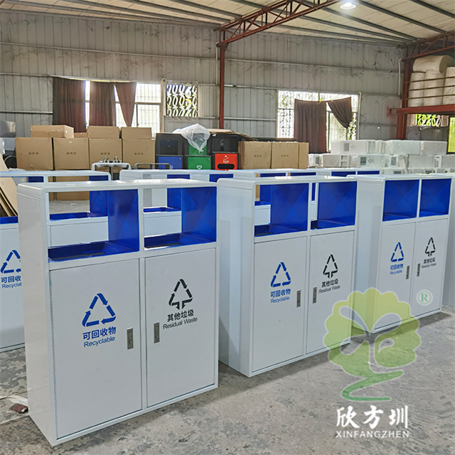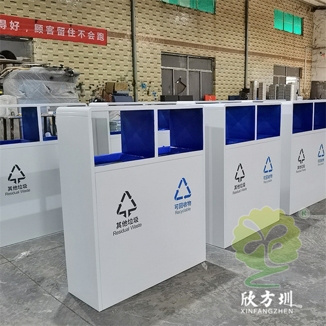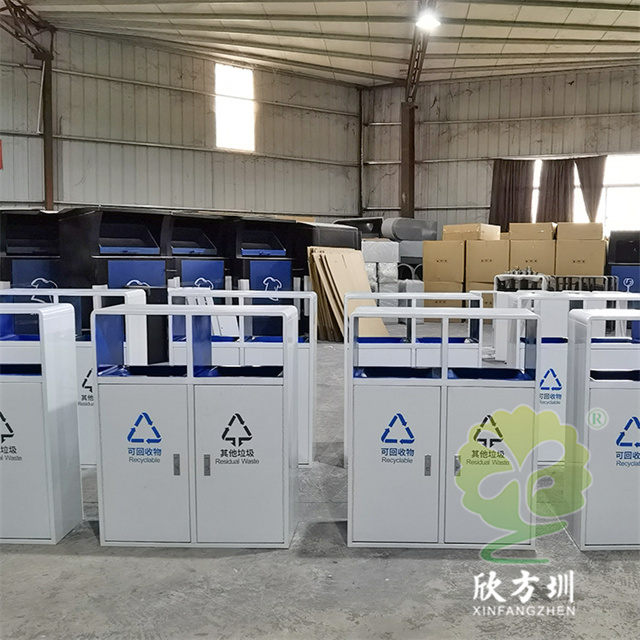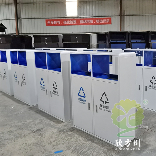 户外烤漆白色两连体镀锌板分类垃圾箱采用了1.00mm厚的镀锌板制作而成,双面投口方形两连体分类设计简洁大气,两面丝网印刷了其他垃圾和其他垃圾的最新国标分类标识,开门方式采用了磁吸方式推拉无需三角钥匙, 我们厂家支持冷轧钢板、不锈钢、表面电镀、烤漆、喷塑上色定制,每个城市都有每一个城市垃圾桶设计方案。