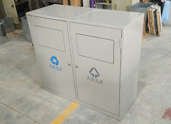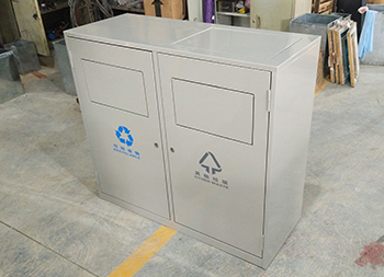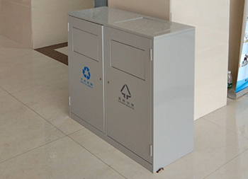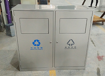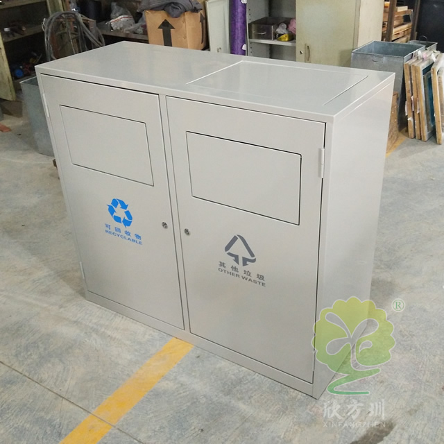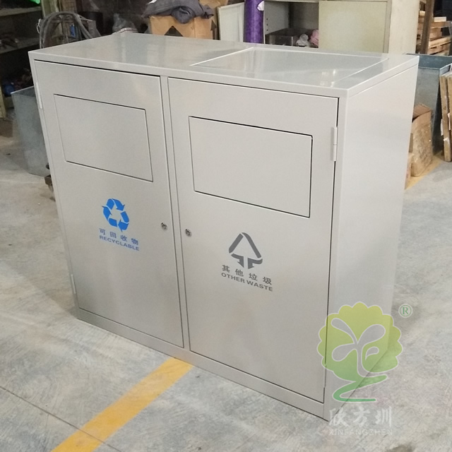 带盖环保钢制分类垃圾箱采用优质的冷轧钢板制造而成,可回收物、其他垃圾两分类带摇盖设计,桶身颜色采用米白色喷塑工艺,正面三角钥匙开门设计,双桶左上方大型摇盖式投口,顶部其他垃圾桶多带一个摇盖投口,支持定制可以选择任意部位开口开门生产。