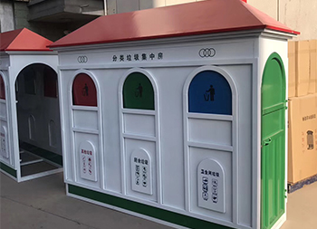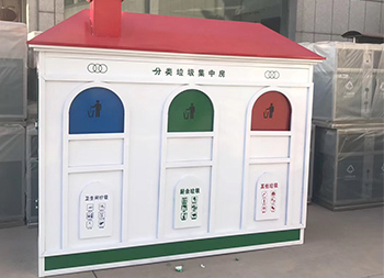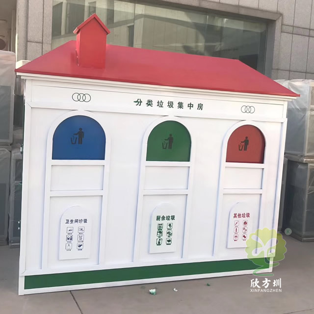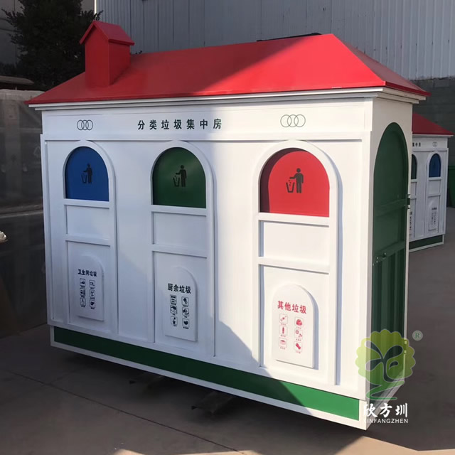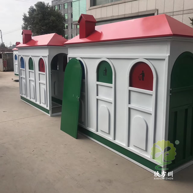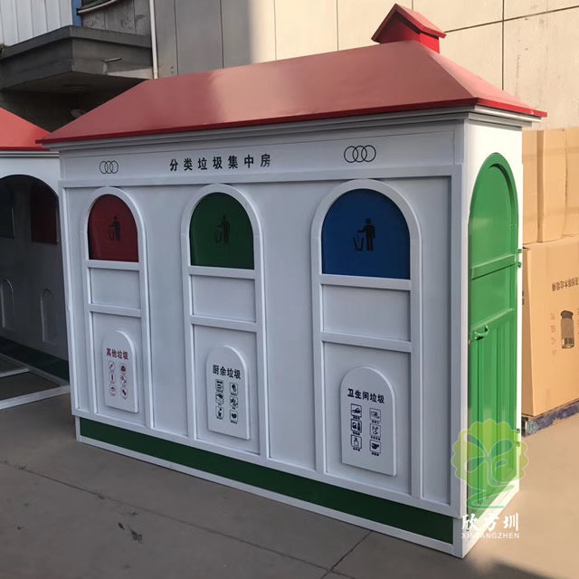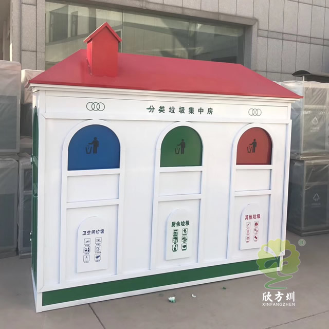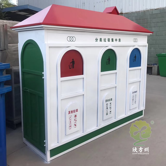 户外大型分类钢制垃圾屋广泛适用于户外物业小区、医院学校等等垃圾分类收集,钢制垃圾桶采用优质的冷轧钢板制作色泽亮丽美观,内筒标配为镀锌板可以另选塑料、玻璃钢、不锈钢、或者塑料内桶等,冷轧钢并具有防潮、防火、防腐、防蛀、防锈、耐高温、易清理不脱落,不起层使用寿命长等特点。