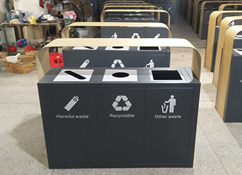 高档仿木纹三分类垃圾桶整体都采用深灰色部分201#不锈钢0.8mm,仿木纹色部分201#不锈钢2.5mm厚0.4mm镀锌板内筒。产品一律用室外粉静电喷塑或者烤漆,经过180°的高温,限度延长了户外垃圾桶的使用寿命,使钢制垃圾桶颜色持久不变,亮丽如新。