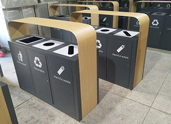 高档仿木纹三分类垃圾桶广泛适用于于垃圾分类收集,如城管系统;环卫系统,物业管理系统,小区、工厂、餐饮,城市道路、各类广场、企业单位、花园、公园、学校、医院、车站、码头、风景旅游区等公共场所。钢制垃圾桶不仅少有此类问题,也容易清洗。钢制垃圾桶采用优质的冷轧钢板制作色泽亮丽美观,并具有防潮、防火、防腐、防蛀、防锈、耐高温、易清理不脱落,不起层使用寿命长等特点。