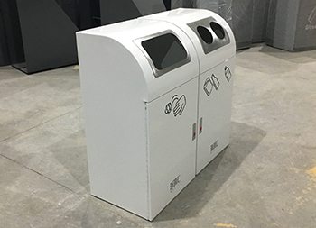 室内冷轧钢板分类环保果皮箱采用了优质的加厚的冷轧钢板制造而成,双桶组合式三分类白色喷塑设计,是一款资源回收箱分别可以回收废纸、易拉罐、玻璃瓶、塑料瓶,丝印了垃圾分类标识和企业logo,正面拉手开门取出内筒内部带磁铁方便开关门,投口为方形和圆形金属本色,这款垃圾桶简洁设计高端上档次。