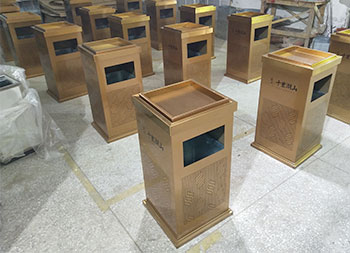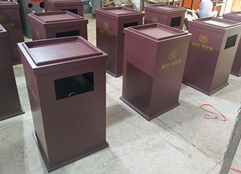 喷塑物业室内方形钢制果皮箱广泛适用于于垃圾分类收集,如城管系统;环卫系统,物业管理系统,小区、工厂、餐饮,城市道路、各类广场、企业单位、花园、公园、学校、医院、车站、码头、风景旅游区等公共场所。钢制垃圾桶不仅少有此类问题,也容易清洗。钢制垃圾桶采用优质的冷轧钢板制作色泽亮丽美观,并具有防潮、防火、防腐、防蛀、防锈、耐高温、易清理不脱落,不起层使用寿命长等特点。 工艺流程:表面经除油——清洗——酸洗——清洗——表调——磷化——清洗——烘干——静电粉末喷涂——高温塑化——冷却。