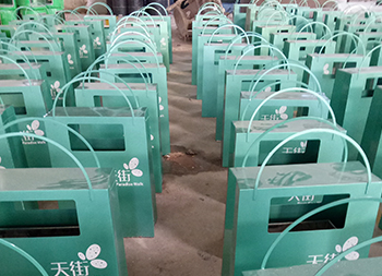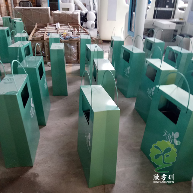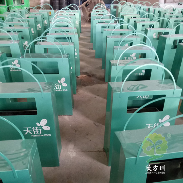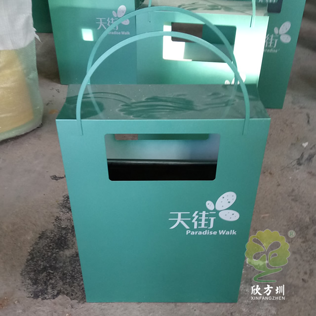 商场创意方形钢板果皮箱采用了优质的冷轧钢板裁剪折弯焊接打磨而成,创意手提式购物袋方形双面方形投口设计,整体浅蓝色高温烤漆,前后丝网印刷了白色的天街的企业logo和名称,远处看就是一个栩栩如生商场的购物袋,侧面可以取出里面的内筒。