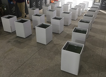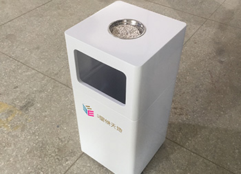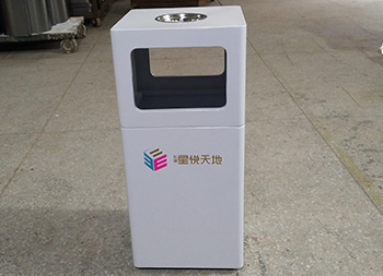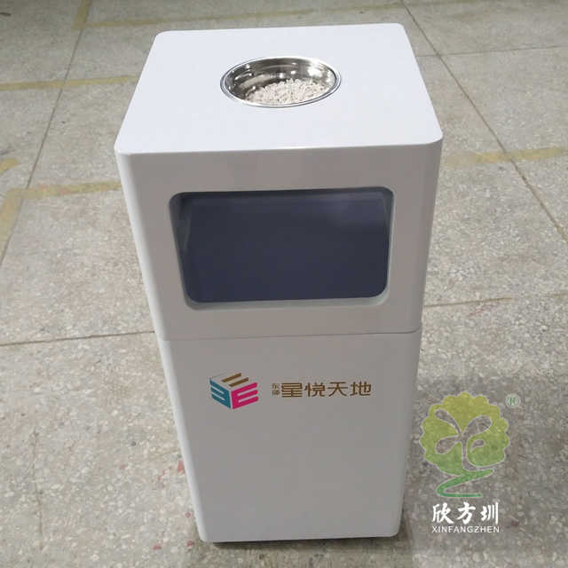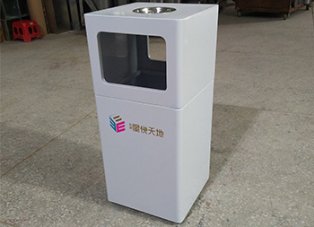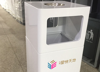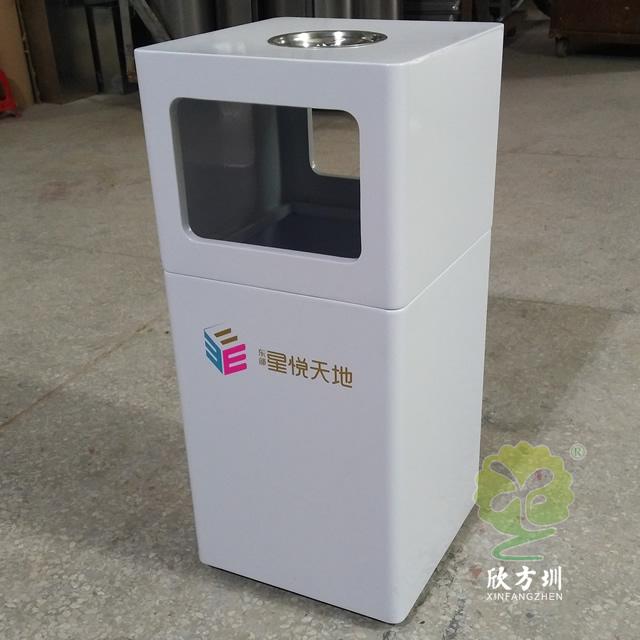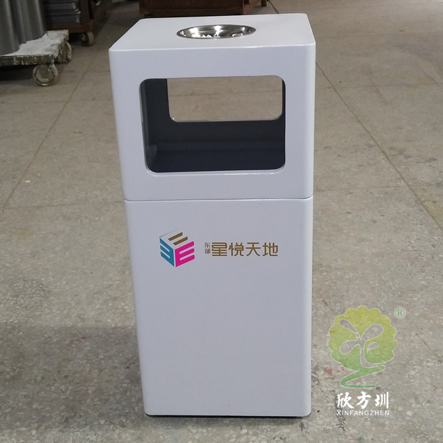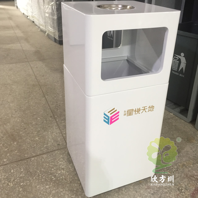 商场室内方形金属钢制果皮箱采用优质的冷轧钢板折弯焊接打磨而成,垃圾桶身整体采用了白色的喷涂喷塑工艺上色,这款垃圾桶是丝印东部新悦天地企业名称和彩色的LOGO,顶部中心位置带一个烟灰盅方便收集烟灰烟头,整体设计简洁美观,支持定制丝印或者使用其他工艺。