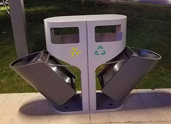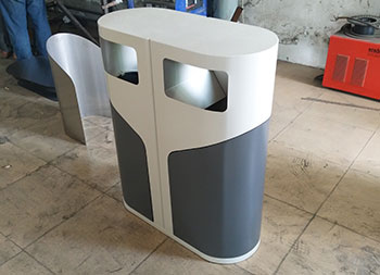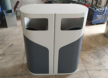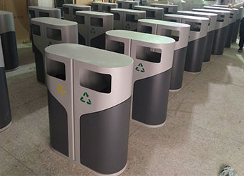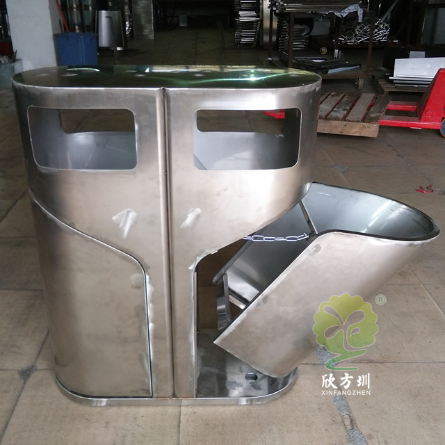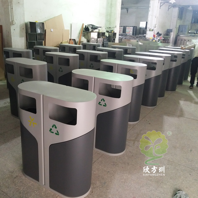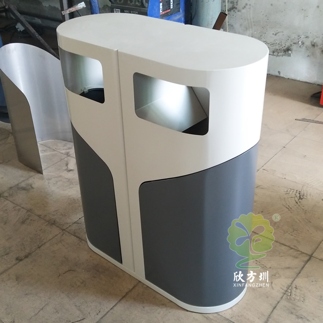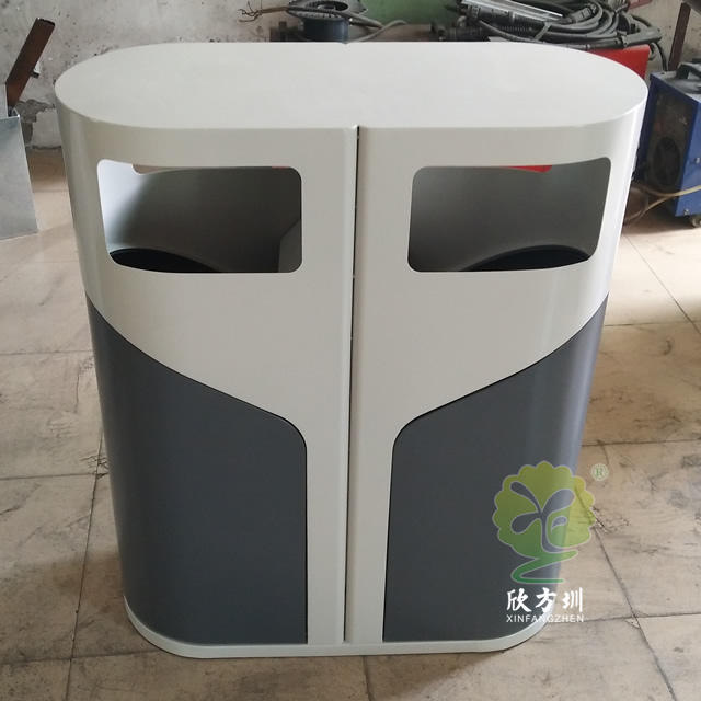 室外侧开门钢制分类垃圾桶采用冷轧钢板机器折弯成型制造,表面通过一系列工艺处理,灰白米白颜色通过喷塑喷粉上色的,无烟灰盅两分类高大上的侧开门设计,适合摆放户外公园、物业小区、市政街道等场景。