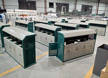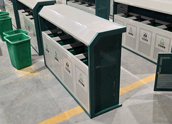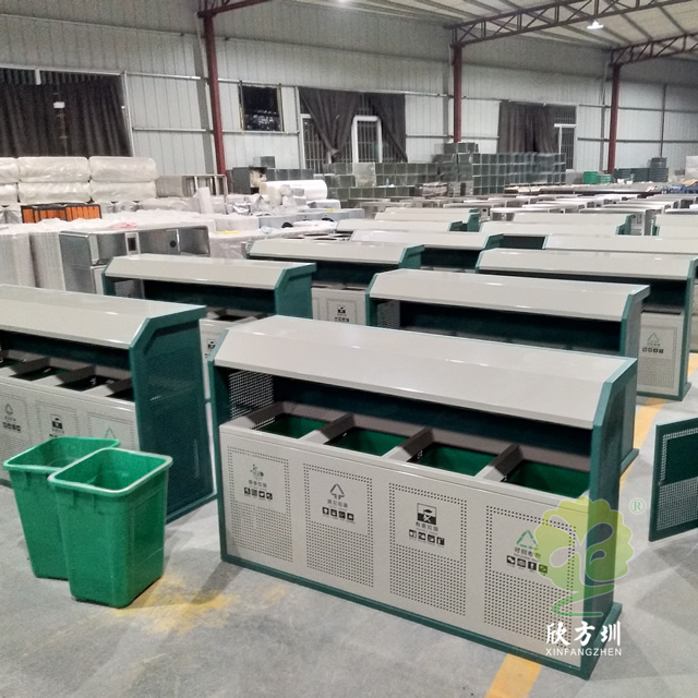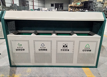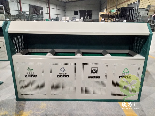 市政街道镂空四分类钢板垃圾箱采用了优质的冲孔镂空冷轧钢板制作而成,四分类厨余垃圾、其他垃圾、有害垃圾、可回收物采用了屋形设计,垃圾桶上色整体米白色和军绿色喷塑工艺,桶身正面和左右的板材采用的是镂空板,后面有三角钥匙方便取出里面的内筒,无烟灰盅并且丝印了分类标识,我们厂家支持定制。