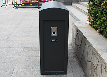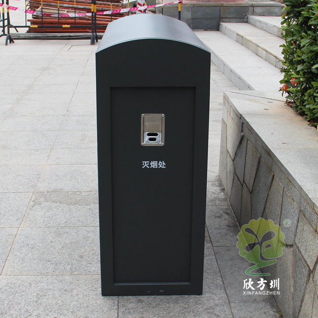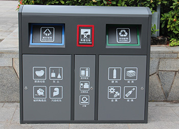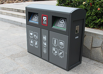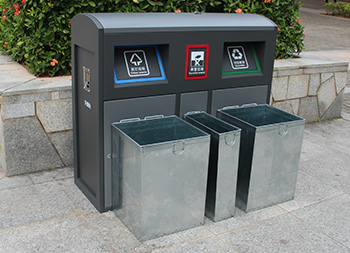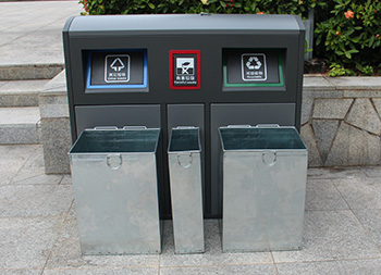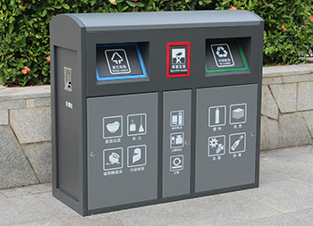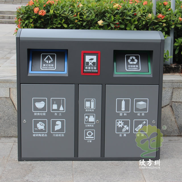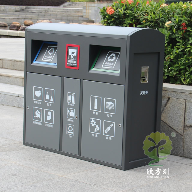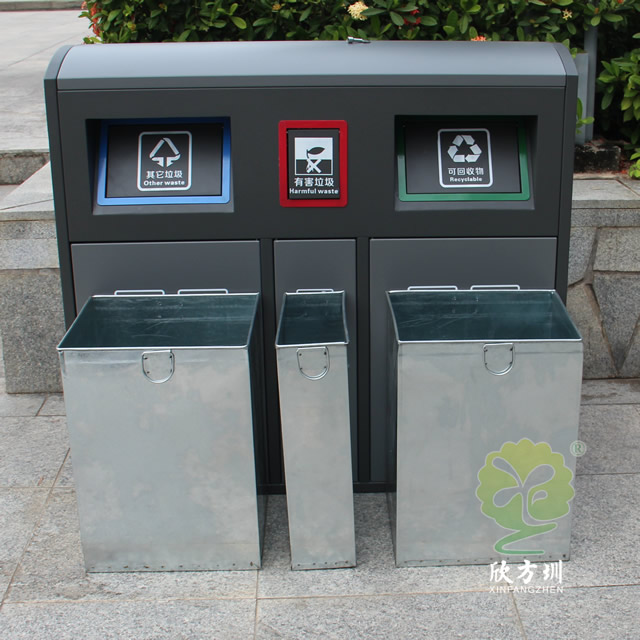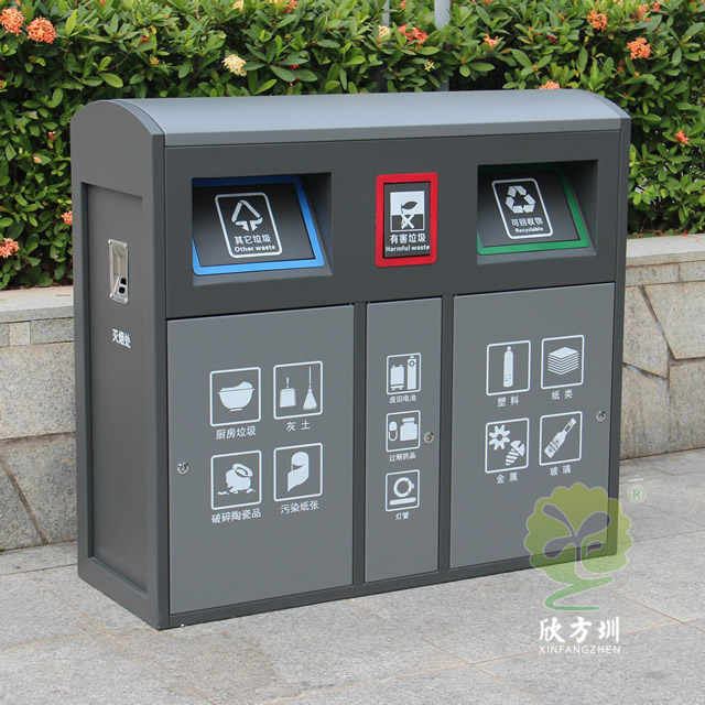 小区喷塑冷轧钢板分类垃圾箱采用了优质的冷轧钢板制作而成,其他垃圾、有害垃圾、可回收物三分类方形摇盖式顶部坡面设计,桶身整体颜色灰色喷涂喷塑工艺,桶身左右两边分别有一个灭烟处,桶身正面和灭烟处还有投口丝印了文字和分类标识,正面三角钥匙开门可以方便的取出内筒来。