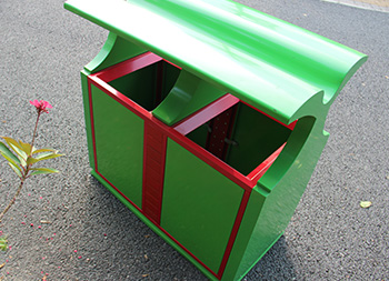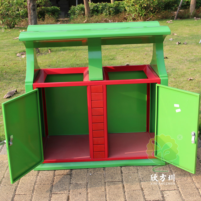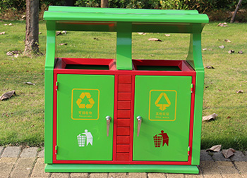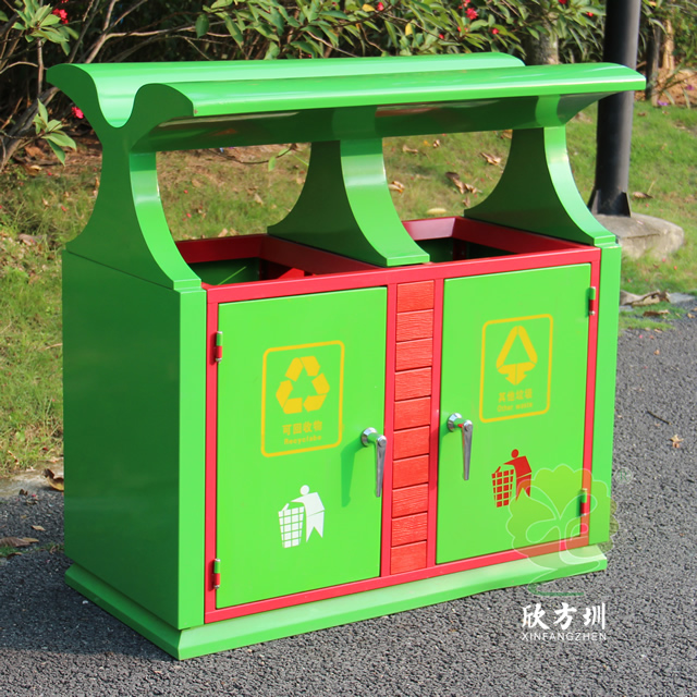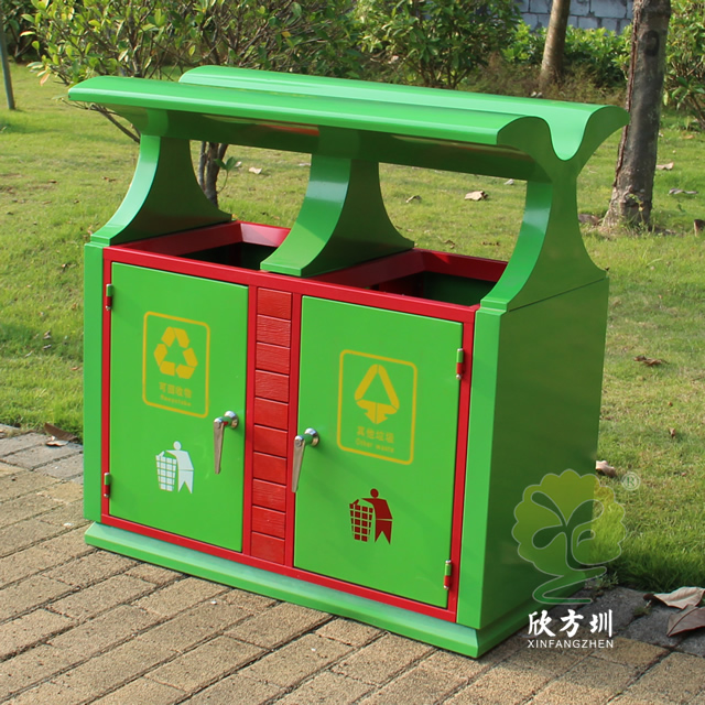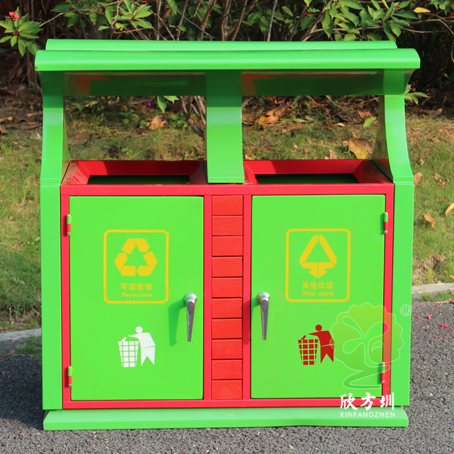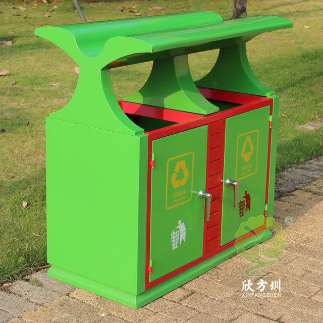 园林冷轧钢板分类垃圾箱采用了优质加厚的冷轧钢板制作而成,可回收物、其他垃圾两分类方形双面投口设计,顶部雨棚坡面方形设计,桶身整体绿色和红色喷塑组合,无烟灰盅和废电池有害物投口,正反两面中心位置是横条红色防腐木的装饰品,直接使用把手开门取出内筒,我们厂家支持定制!