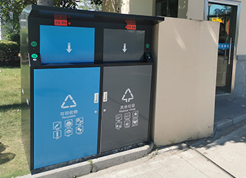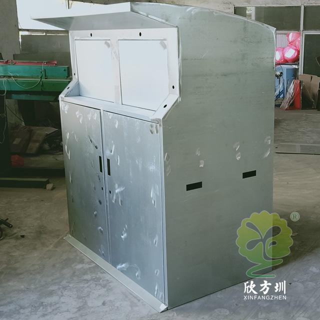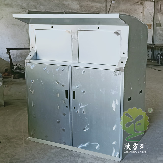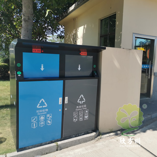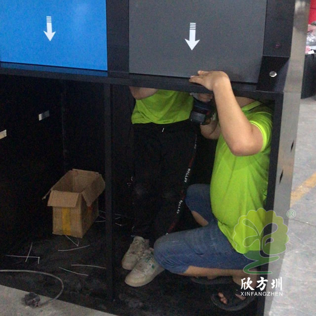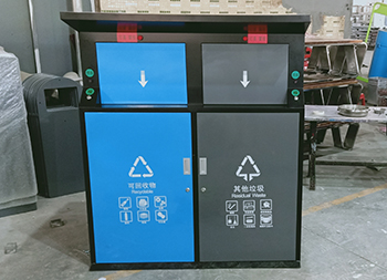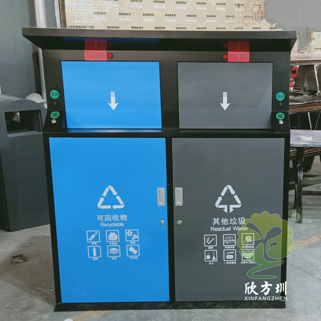 户外智能钢板分类垃圾箱采用了优质的冷轧钢板裁剪折弯成型,经过焊接师傅好人工打磨平整,垃圾桶表面喷塑了黑色、灰色、蓝色三种颜色,采用了方形两分类设计,在由我们的印刷师傅在垃圾箱表面丝网印刷漂亮的分类图标文字等,接下来就是组装这款垃圾桶的真正的核心部位智能芯片以及配件,这款智能垃圾箱可以感应也可以旁边按钮开门投递垃圾。