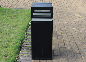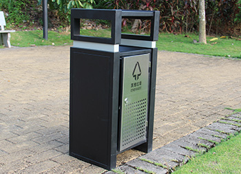 方形组合式钢板分类垃圾桶采用加厚的优质的冷轧钢板裁剪打磨工艺制作而成,方形组合式前后镂空设计,桶身整体为黑色喷涂喷塑工艺上色,投口旁边左右两横杆采用了白色喷塑,垃圾桶前后保留了金属银色,桶身前后钣金冲孔工艺并且丝印垃圾分类图标,三角钥匙开门取出内筒。