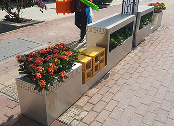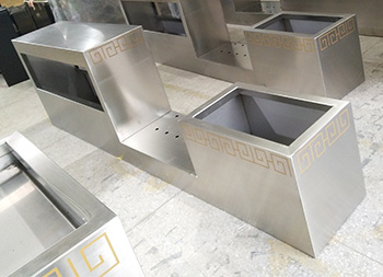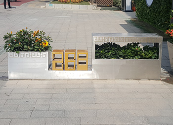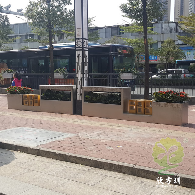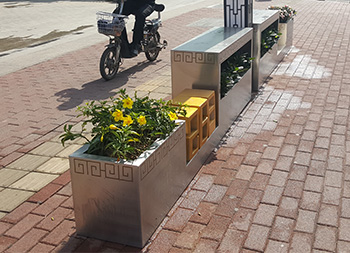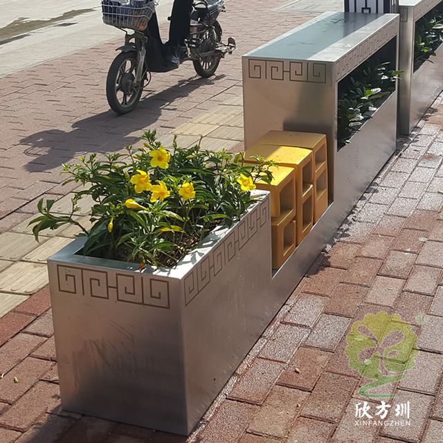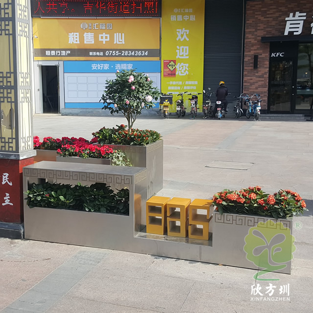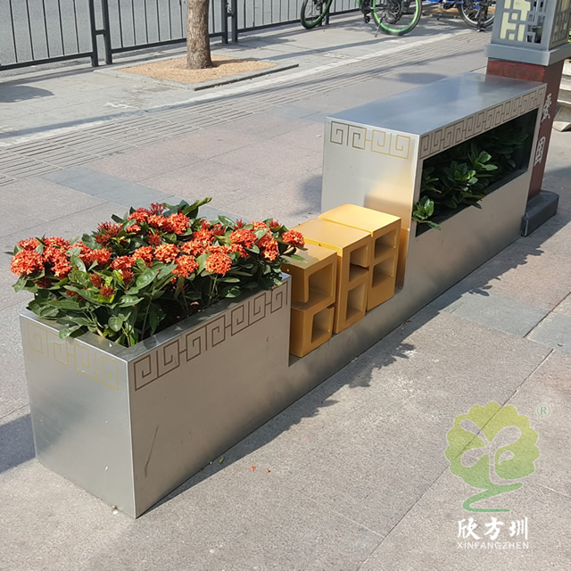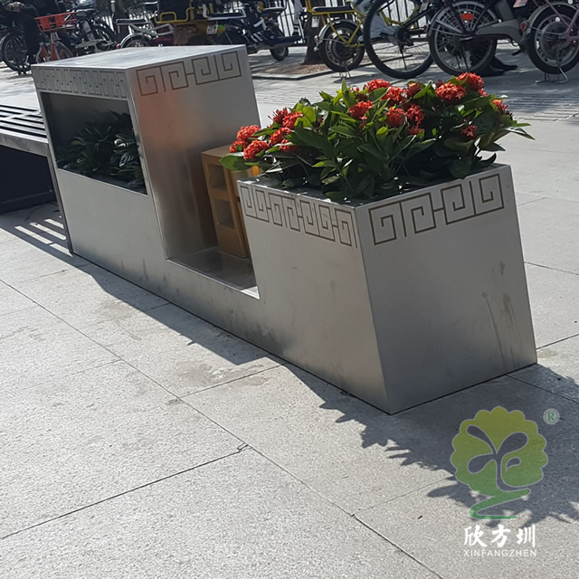 户外街道大型创意不锈钢花箱通过表面电镀压纹、水镀、蚀刻、电镀、无氰碱性亮铜、纳米镍、等技术的工艺处理,具有坚固耐用,抗老化,强度高,耐腐蚀,耐酸碱,等不易褐色使用寿命长的功效。不锈钢表面处理(镀钛、镜面、拉丝、蚀刻)加工工艺的提高,外观美观度实用等一系列产品特质更适用于室内外的工程使用。
