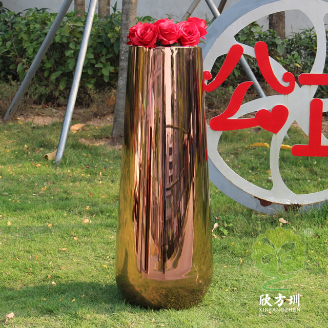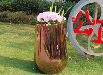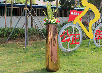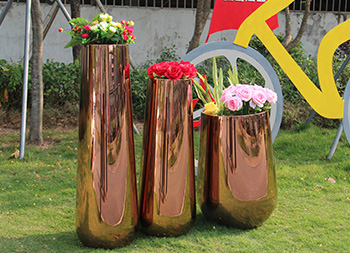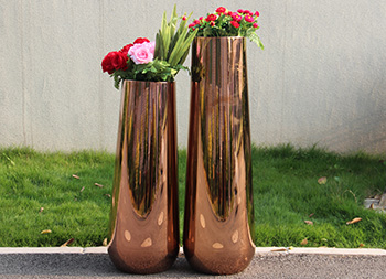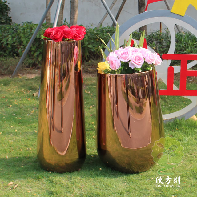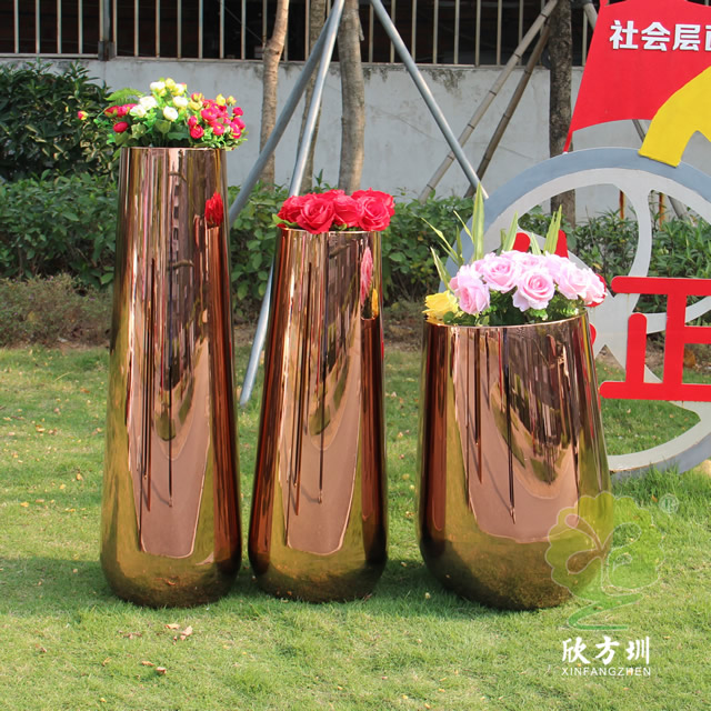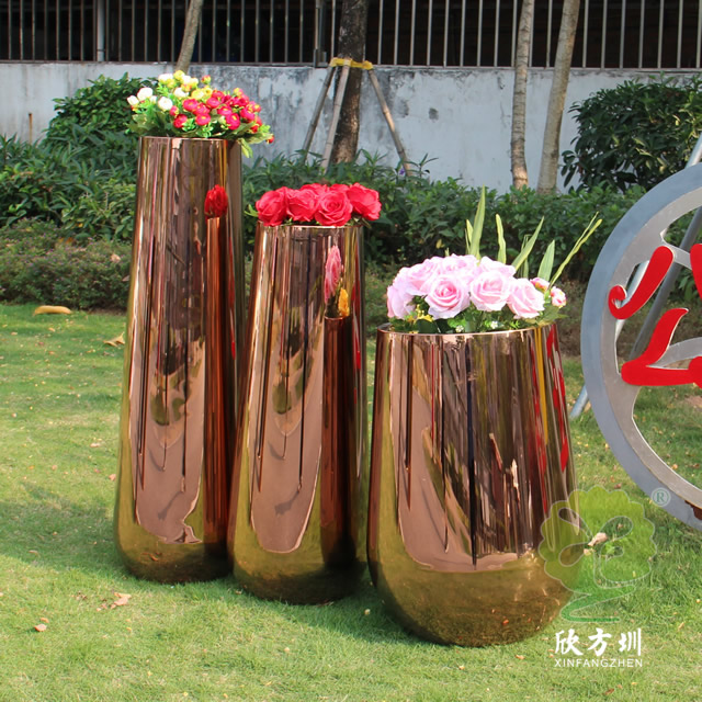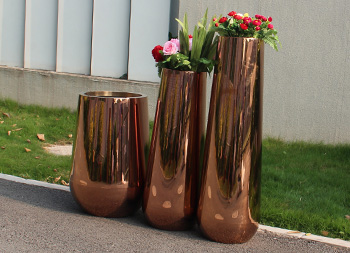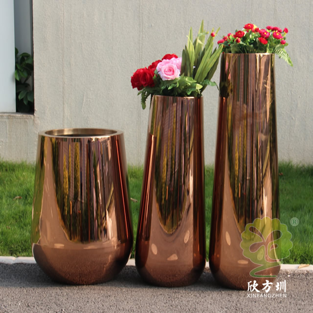 商场镜面玫瑰金不锈钢花盆通过表面电镀压纹、水镀、蚀刻、电镀、无氰碱性亮铜、纳米镍、等技术的工艺处理,具有坚固耐用,抗老化,强度高,耐腐蚀,耐酸碱,等不易褐色使用寿命长的功效。不锈钢表面处理(镀钛、镜面、拉丝、蚀刻)加工工艺的提高,外观美观度实用等一系列产品特质更适用于室内外的工程使用。