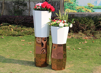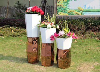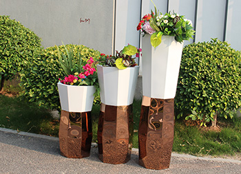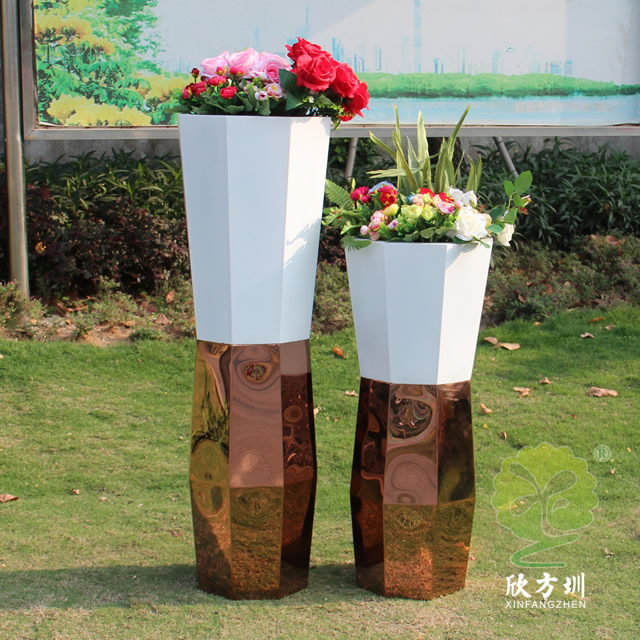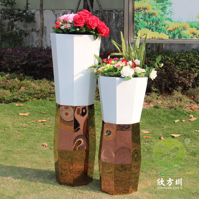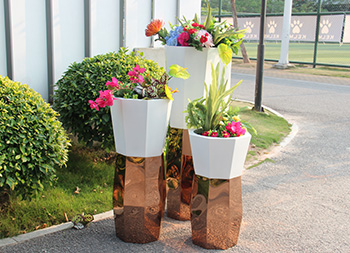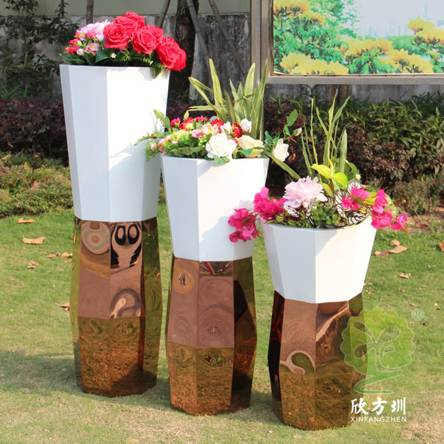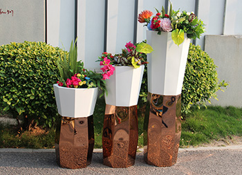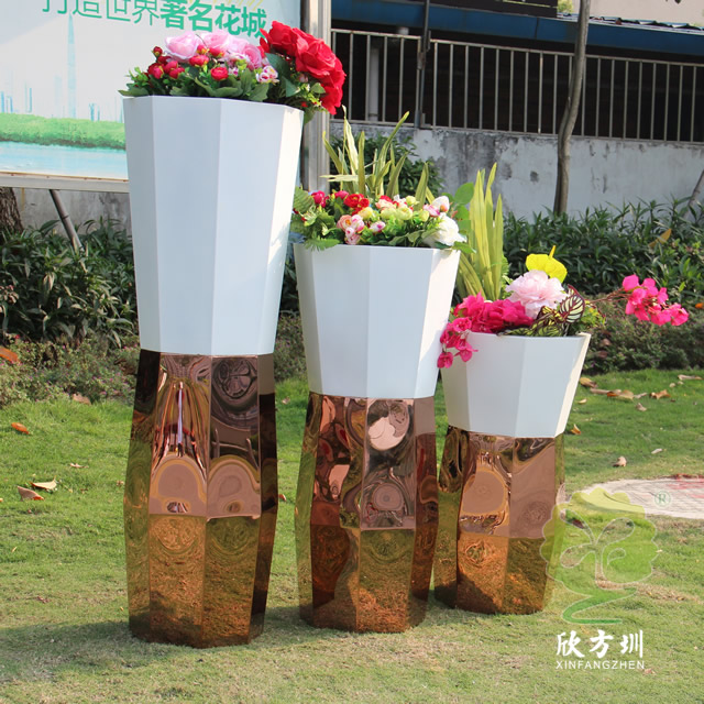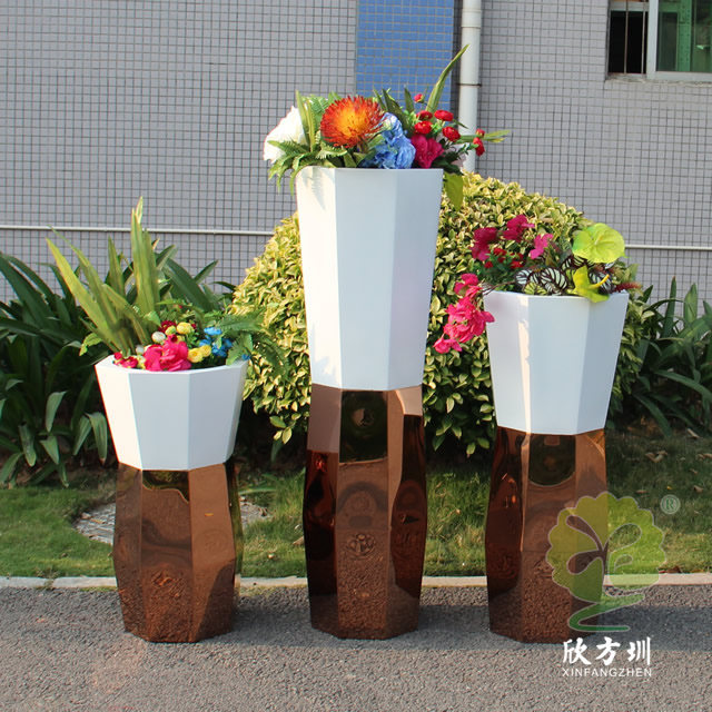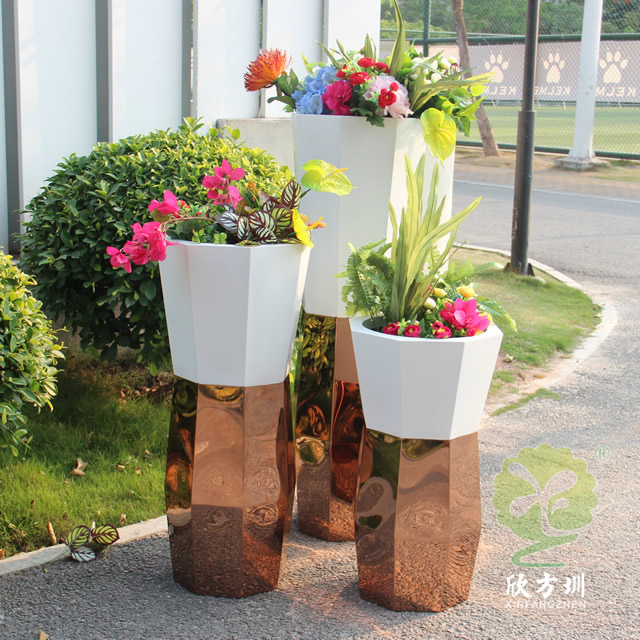 室内喷塑白色玫瑰金不锈钢花盆通过表面电镀压纹、水镀、蚀刻、电镀、无氰碱性亮铜、纳米镍、等技术的工艺处理,具有坚固耐用,抗老化,强度高,耐腐蚀,耐酸碱,等不易褐色使用寿命长的功效。不锈钢表面处理(镀钛、镜面、拉丝、蚀刻)加工工艺的提高,外观美观度实用等一系列产品特质更适用于室内外的工程使用。