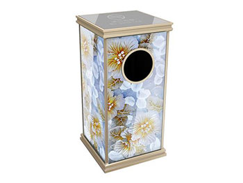欣方圳钛金垃圾桶由镀金钢板或不锈钢和大理石制作而成,表面经除油、清洗、酸洗、清洗、表调、磷化、清洗、烘干、静电粉末喷涂、高温塑化、冷却等工艺处理。极耐磨损、耐酸、耐碱,耐腐蚀性,永远不会生锈。产品表面呈金黄色,光滑亮丽,彰显高贵本色,适用于各种高档室内场合。