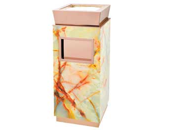 欣方圳钛金垃圾桶由镀金钢板或不锈钢和大理石制作而成,表面经除油、清洗、酸洗、清洗、表调、磷化、清洗、烘干、静电粉末喷涂、高温塑化、冷却等工艺处理。极耐磨损、耐酸、耐碱,耐腐蚀性,永远不会生锈。产品表面呈金黄色,光滑亮丽,彰显高贵本色,适用于各种高档室内场合。