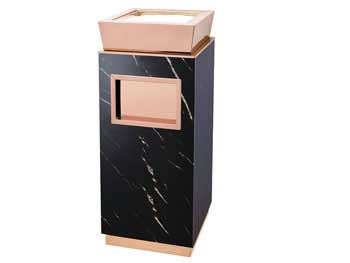 欣方圳钛金垃圾桶由镀金钢板或不锈钢和大理石制作而成,表面经除油、清洗、酸洗、清洗、表调、磷化、清洗、烘干、静电粉末喷涂、高温塑化、冷却等工艺处理。极耐磨损、耐酸、耐碱,耐腐蚀性,永远不会生锈。产品表面呈金黄色,光滑亮丽,彰显高贵本色,适用于各种高档室内场合。