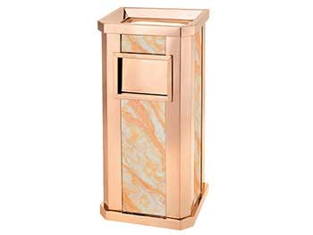 欣方圳钛金垃圾桶由镀金钢板或不锈钢和大理石制作而成,表面经除油、清洗、酸洗、清洗、表调、磷化、清洗、烘干、静电粉末喷涂、高温塑化、冷却等工艺处理。极耐磨损、耐酸、耐碱,耐腐蚀性,永远不会生锈。产品表面呈金黄色,光滑亮丽,彰显高贵本色,适用于各种高档室内场合。