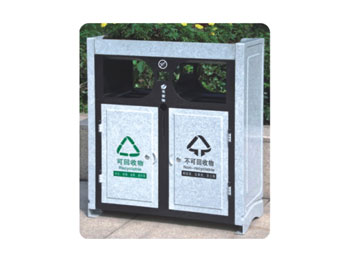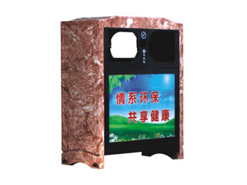 仿大理石垃圾桶的整体造型大气美观:箱体、盖、侧板和门颜色为青灰花色,而前板后板、投放口、内桶均为黑色,门跟合页装有自动关起装置,并标有“可回收”和“不可回收”的字样;在功能上还具有抗腐蚀、抗酸碱、抗紫外线、在自然条件下能耐高低温、没有回收盗用价值等优点。