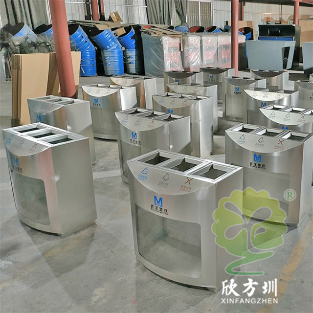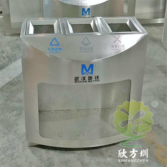 武汉室内地铁站不锈钢分类垃圾桶采用了优质的201不锈钢1.0mm厚的板材制造,型号:C907,尺寸规格:705*390*745mm,透明部分采用了3.0mm厚的亚克力板,三分类方形设计,这款垃圾桶不含内筒,直接套用透明塑料垃圾袋使用,丝网印刷了可回收物、其他垃圾、有害垃圾以及武汉地铁logo标识。