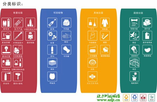 在我国2003年10月,国家出台了《生活垃圾规则条例》。根据国家制定的统一标志,生活垃圾被重新划分为四类,它们分别是可回收垃圾、厨余垃圾、有害垃圾和其他垃圾。