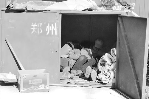 12月21日中午12点,西三环与长江路口附近,5名女环卫工由于中午休息时间短无法回家,而附近又没有休息室,就挤进一个垃圾箱中歇息。
