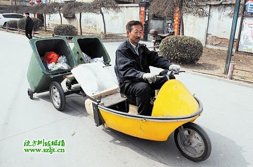 山西省城许坦西街山西路桥一公司北张小区内,为清运垃圾,退休电工郭师傅自制了一辆环卫电动车。这辆车的前半部分呈船头状,前端有方向把手和座位;电动后驱动力设计,还有减震、尾灯和倒挡;环卫电动车后半部分的大梁上焊接有两个铁钩子,钩子上可以加挂两只带轮子的垃圾桶。