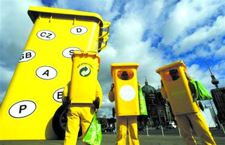 在这种情况下,德国开辟了第三条道路。1991年通过的《包装法规》从另一个角度解释了“谁生产,谁负责”的原则,指出使用包装物的厂商应对包装物垃圾的产生承担责任,因此也有义务把这些垃圾回收再利用。一些厂商联合成立了绿点公司负责回收利用,它们在自己商品的包装上使用统一的绿点标志,带有这一标志的包装物可装进统一制作发放的黄色塑料袋,由绿点公司回收再利用,其费用由厂商承担——当然也有一部分费用打进了商品价格里。